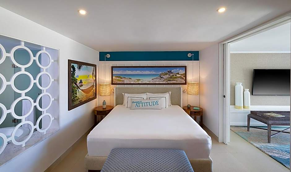 This suite features a sitting area, a terrace with a table and chairs. It also includes a bathroom that includes a shower and a bathtub.